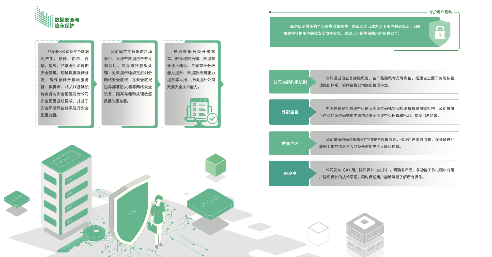 “360公司从建立之初就将用户信息安全和隐私安全作为公司的生命线是行业内首家任命首席隐私官的互联网安全公司,并在集团内率先设立“数据安全委员会”,统筹全集团数据安全和个人信息保护监督管理。为进一步提升产品及服务的安全性和隐私合规能力,360集团按业内最高要求,对标27000系列国际安全标准,自顶向下建立全面的信息安全和隐私管理体系,并将多年积累的对攻防的理解和实战经验融入体系建设中,在业务安全建设、安全运营体系、管理流程和个人信息保护领域不断完善内部建设,保证公司产品和服务的开发测试发布严格遵循体系要求,用实际行动保障数亿用户的数据和隐私安全。